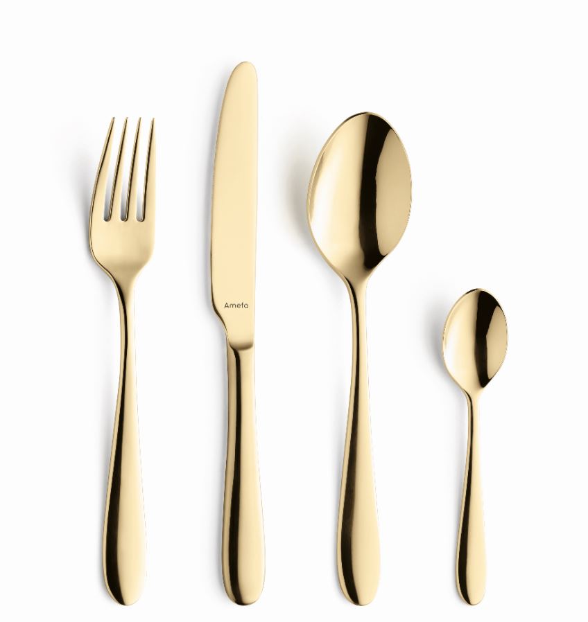 Amefa har 86 års erfaring i produksjon av bestikk i 18/0 eller 18/10 rustfritt stål. De bruker høykvalitetsstandarder til alle deres produkter for å sikre holdbarhet og varig ytelse. Amefa tilbyr et bredt utvalg av bestikkmønstre, alt designet med balanse mellom form og funksjon. Amefa tilbyr produkter som passer til ethvert budsjett. Det fargede bestikket har et tynt lag med titanbelegg som gir den unike fargen.